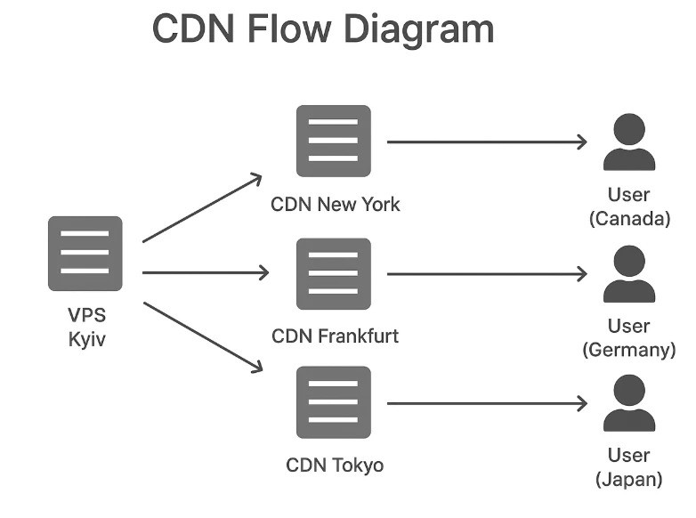 User (Canada) → CDN New York → VPS Kyiv User (Germany) → CDN Frankfurt → VPS Kyiv User (Japan) → CDN Tokyo → VPS Kyiv